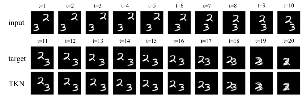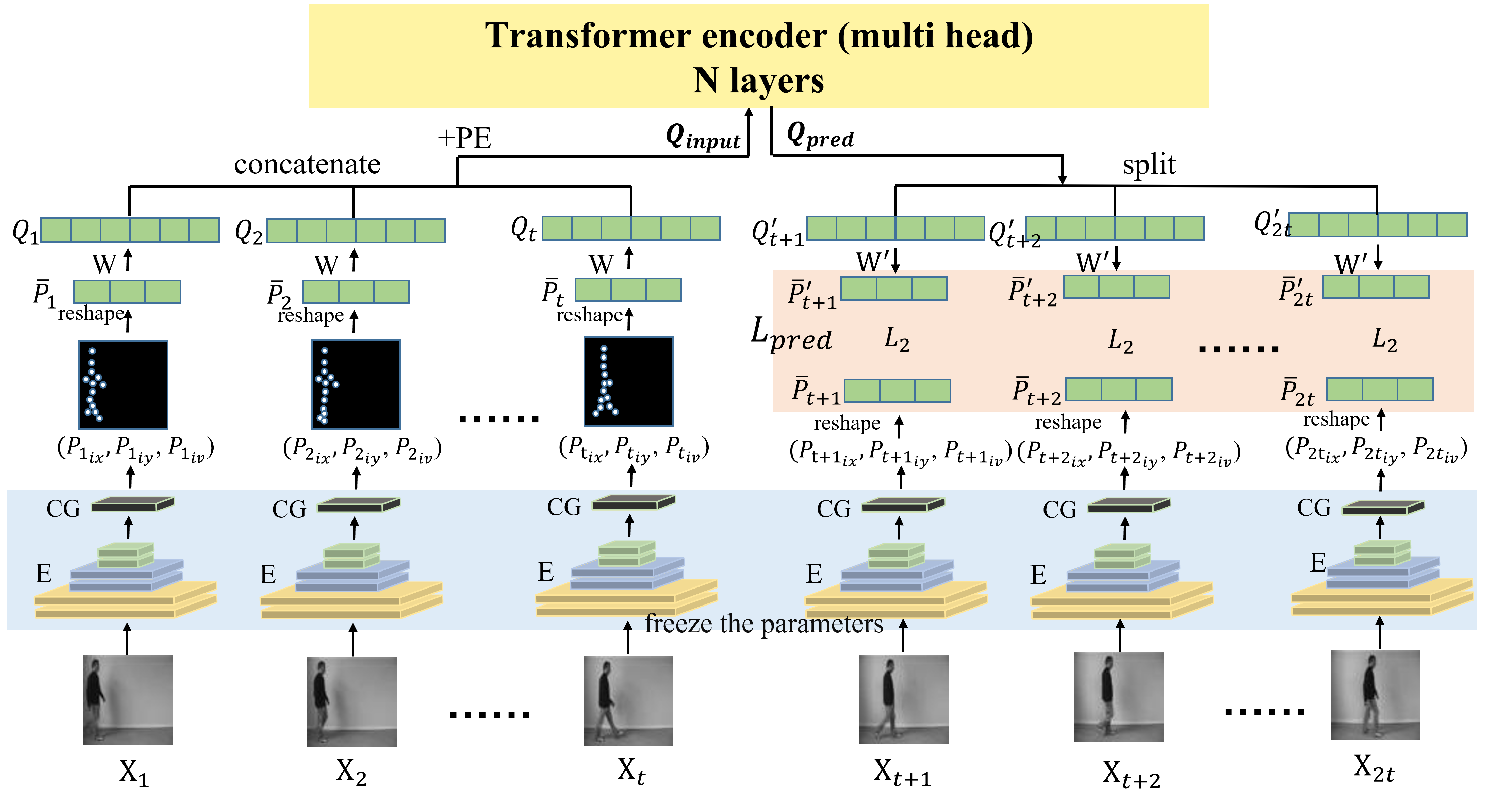 The overview of TKN. Two main modules are the Keypoint Detector and the Predictor marked with the blue and yellow undertones. The predicted frame uses the background information extracted from the last frame of the input. Both the inputting stage and prediction stage allow batch processing (e.g., input multiple frames simultaneously) and thus enable temporal parallelism. Note that the ground truth keypoints information, Preal = ( Pt+1, …, P2t ), is output by Xt+1, …, X2t using the keypoint detector (excluded from the figure for simplicity). Lpred loss is marked with the red undertones.